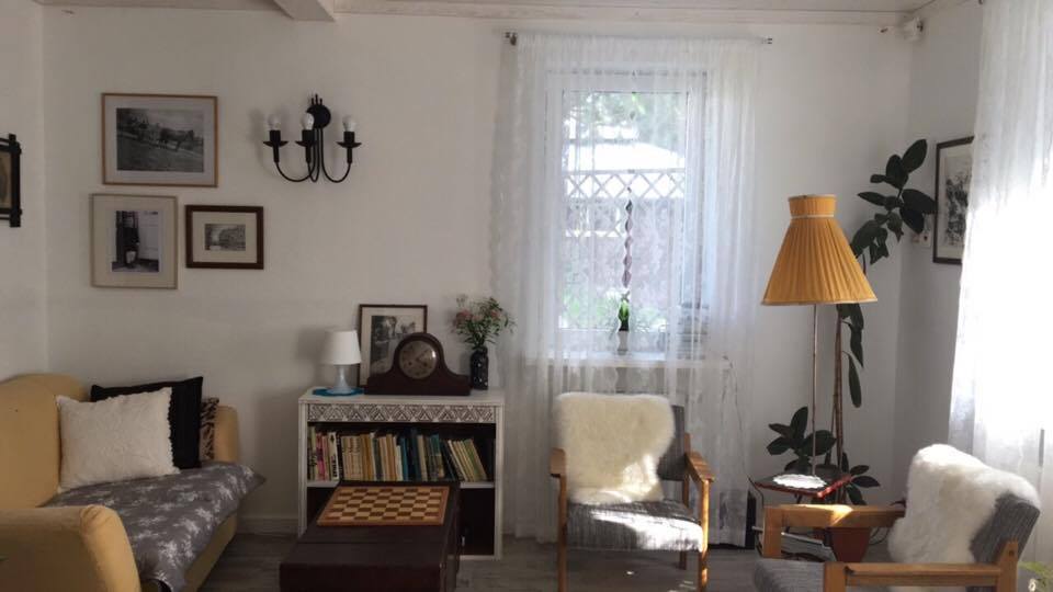 Styl pomieszczeń na dole i 4 pokoi na górze określiłabym jako efekt ożenku stylu rustykalnego z nowoczesnym podejściem do sprawy. Zatem nie będzie udawania, że jesteśmy w Skandynawii, ale też nie będzie przytłaczającej sugestii, że jesteśmy na wsi, więc nie będziemy spać na drewnianych łóżkach wypchanych siennikami ze słomą. Wszystkie elementy „wiejskie” jak kilimy po babci, stojaki na paprotki, drewniane szafy, babcine kredensy i zdjęcia rodziny czy znajomych sprzed wojny czy tuż powojenne przedstawiające ludzi w polu czy stojących pod płotem funkcjonują tam na zasadzie cytatu nie zaś głównego środka wyrazu. Wygodne, duże łóżka z Ikei, czy pościel komponują się z białymi deskami, którymi wykończone są podłogi i pochyłe stropy. Każdy pokój zawiera jakieś cenne znalezisko z olx czy ze sprzedajemy.pl, a to komodę z lat 50 – tych, a to krzesło „ludwik” wykończone czerwonym aksamitem, wybitnie się na nim duma o przemijalności i bezsensie egzystencji patrząc przez okno w dachu na drzewa z pobliskiego lasu. Są tam urocze etażerki, stoliczki, krzesła, ozdobne kanki na mleko, obrazy wzbudzające niepokój, zero zbędnych rzeczy, polne kwiatki w butelce, zasuszone elementy łąki na obrazkach za szybką, piękne dywaniki przełamujące surowość bieli panującej w pokojach, skrzypienie podłóg, brzęczące namolne muchy, bezpretensjonalne funkcjonalne łazienki. Ogólnie całość taka, że zamiast latać po polach chce się tam siedzieć i siedzieć i siedzieć i albo coś albo nic i jest najlepiej.